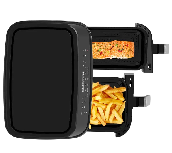 - **تقنية الطهي المزدوجة:** تتميز بنظام تدفئة مزدوج يضمن توزيع الحرارة بشكل متساوي حول الطعام، مما يؤدي إلى نتائج طهي متسقة ومقرمشة من كل جانب.